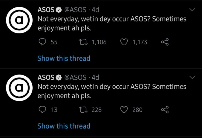 The Nigerian social media space has always been an intriguing one for me, largely because virality can be instant and you are just a (re)tweet away from an online trend that could mean instant popularity (good or bad). Even more interesting is how recently, global brands and personalities are quite eager and ready to interact with Nigerian Twitter and its jovial spirit – cue in Jack, Enisa and more recently, ASOS.